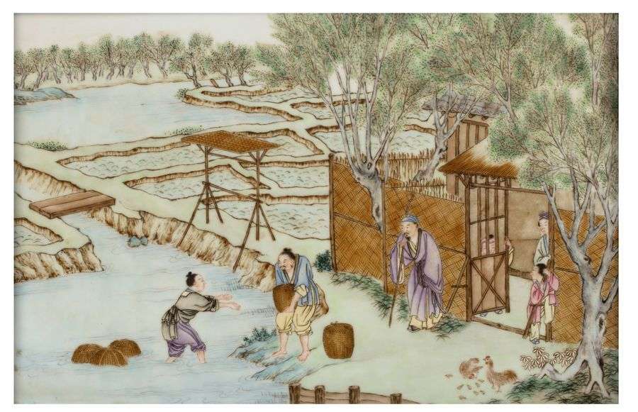 Deux plaques en porcelaine et émaux polychromes, représentant deux scènes agricoles animées de personnages, l'une montrant des paysans travaillant dans des rizières sous le regard d'un dignitaire, et l'autre montrant des artisans produisant des cordes. (Un encadrement en bois légèrement déformé, l'autre gercé et usure de l'émail l’autre gercé et usure de l’émail 木框变形,