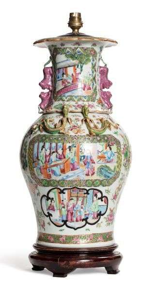 Vase balustre en porcelaine de Canton, à décor en émaux de style famille rose de scènes de palais animées de personnages, compositions florales, la base du col ornée de dragons salamandres et lions en relief.
