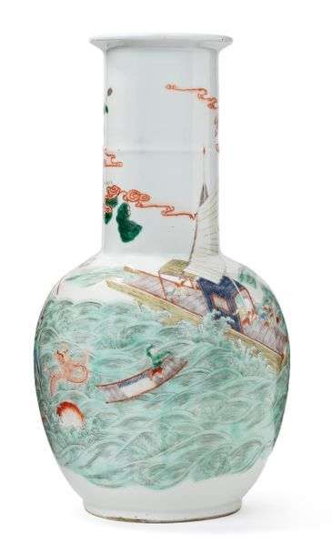 Vase à panse arrondie et haut col, en porcelaine à décor en émaux polychromes représentant le dieu Zhongkui combattant un dragon pour défendre les embarcations sur les flots. Marque apocryphe Kangxi sur la base.
