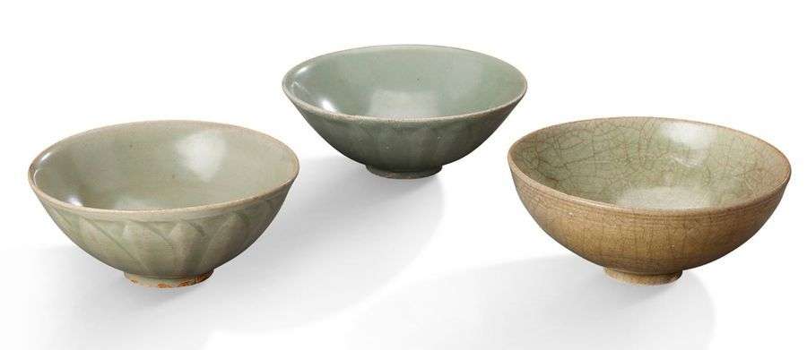 Lot de trois coupes en grès et émail céladon, dont deux à décor moulé de pétales de lotus.