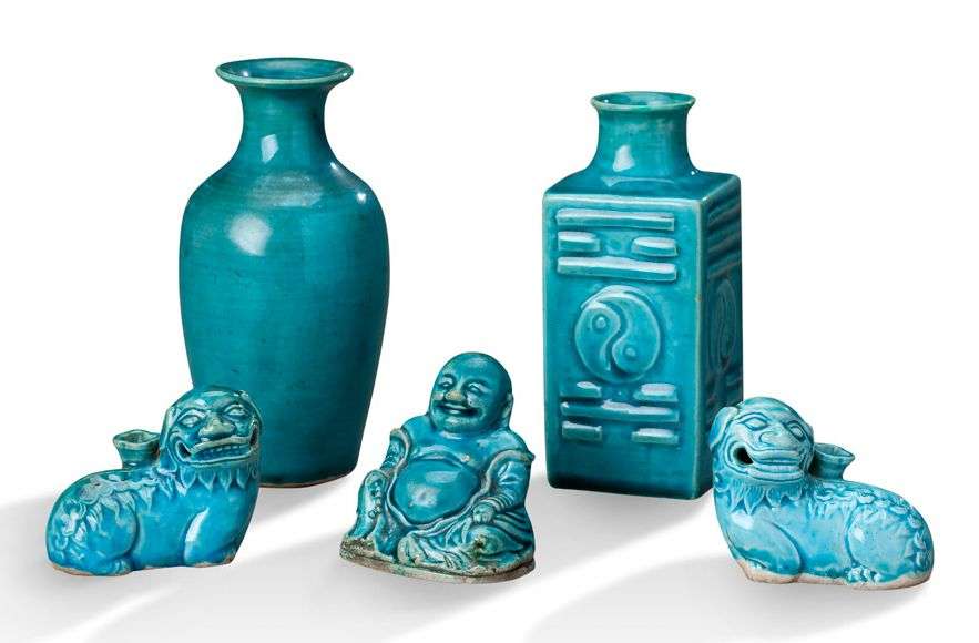 Lot de cinq objets de lettrés en biscuit et émail bleu turquoise, comprenant trois porte-baguettes à encens en forme de lions et bouddhaï, un vase Cong orné des bagua et du taiji, et un vase balustre. (Petites égrenures, restauration au col du vase Cong)