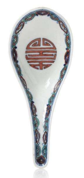 Cuillère en porcelaine et émaux doucai, à décor du caractère shou, guirlandes de ruyi, chauves-souris, et lotus.