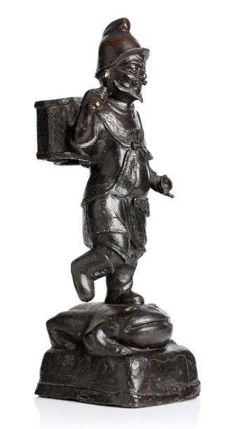 Important groupe en bronze représentant un porteur d'eau étranger sur la route de la soie, marchant sur un crapaud géant.