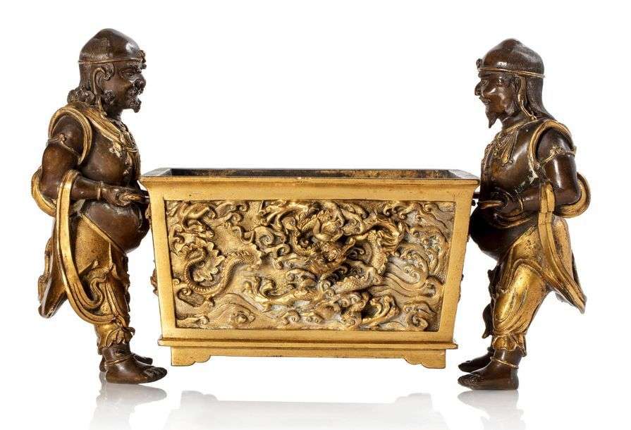 Exceptionnel brûle-parfum en bronze partiellement doré, de forme rectangulaire, porté sur les petits côtés par deux personnages dit Huren (barbares d'origine persane) qui forment les anses, la cuve à décor en relief sur les quatre côtés de dragons poursuivant la perle sacrée parmi des nuages stylisés. Marque apocryphe Xuande à six caractères de style kaishu sur la base. (Terrasse probablement manquante).