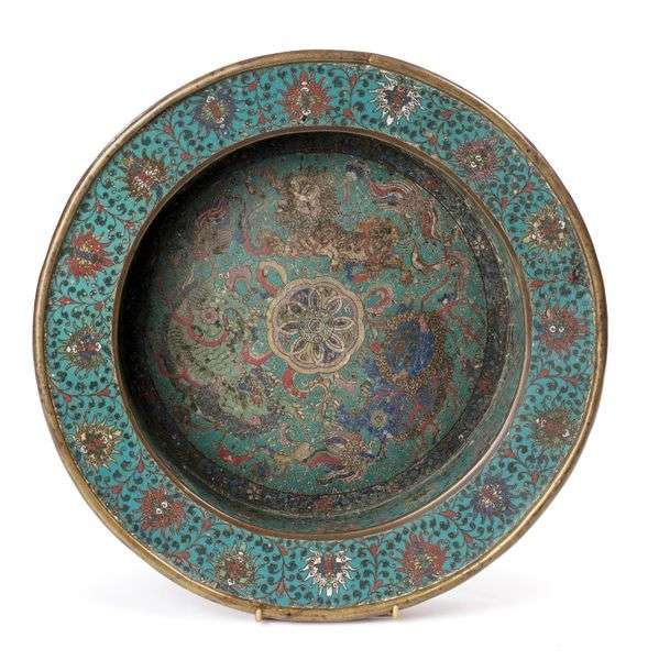 Bassin en cuivre et émaux cloisonnés polychromes sur fond bleu, orné à l'intérieur de trois lions bouddhiques autour du joyau sacré, la paroi verrticale et le rebord plat ornés de fleurs de lotus et rinceaux feuillagés.