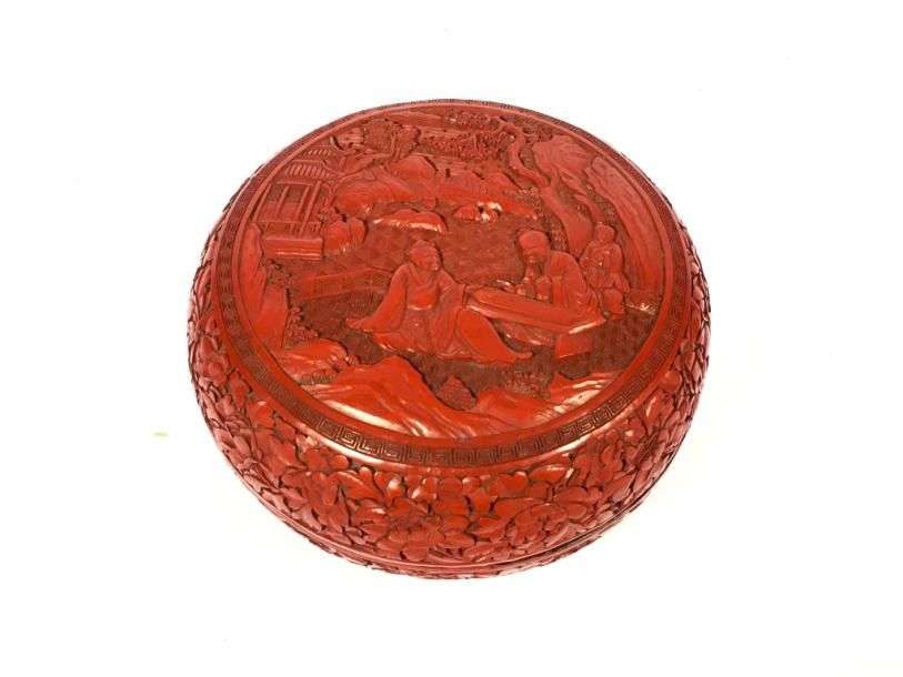 Boîte en laque rouge cinabre sur métal à décor de deux sages et d'un enfant dans un paysage montagneux. (Petits éclats sur le portour de la boîte à l'intérieur)