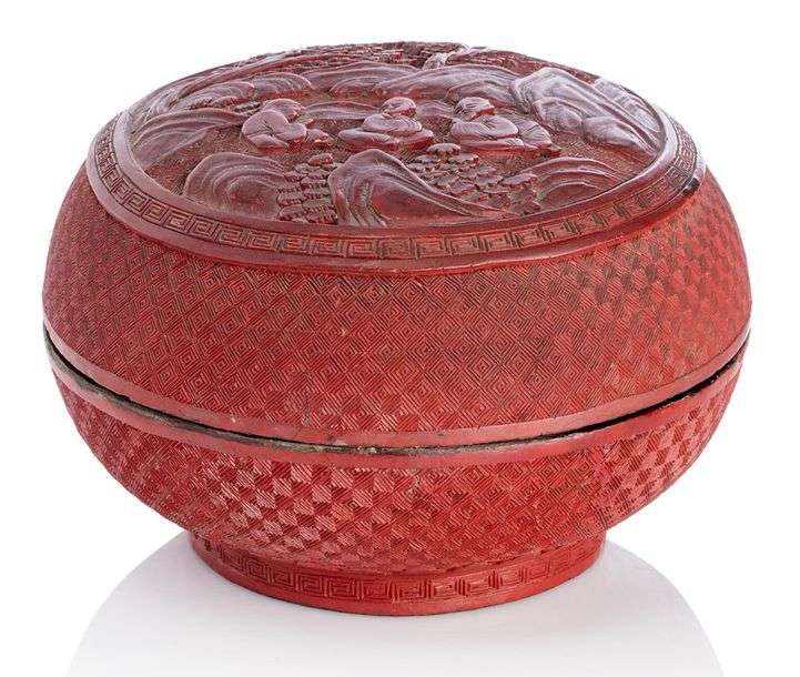 Boite sphérique en laque de cinabre sculptée, le couvercle à décor de sages devisant dans un paysage, le pourtour orné d'un damier de losanges, le pied souligné de pétales de lotus, l'intérieur et la base laqués noirs. (Petites restaurations et usures)