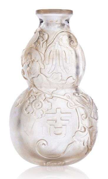 Flacon tabatière en verre en forme de coloquinte, finement sculpté de feuillages et fleurs entourant des motifs calligraphiés évoquant le bonheur (daiji).