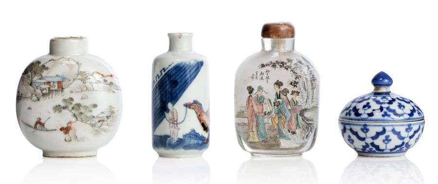 Lot de quatre objets, dont trois tabatières, l'une en verre peint à l'intérieur de la légende de Dushi Niang| la deuxième cylindrique, en porcelaine ornée en rouge et bleu sous couverte, d'un chameau et son chamelier| la troisième en porcelaine à décor polychrome d'un paysage et d'un poème, avec marque apocryphe Qianlong| le quatrième objet, une petite boite à cire en porcelaine bleu-blanc.