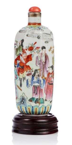 Flacon en porcelaine et émaux de la famille rose, la panse de forme octogonale allongée, ornée de plusieurs personnages, hommes, femmes et enfants, chacun tenant une fleur. Avec bouchon de tabatière.