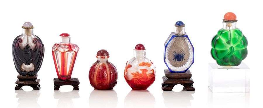 Lot de six tabatières en verre de Pékin, quatre à décor overlay rouge, bleu ou brun-mauve sur fond translucide, de poissons sur l'eau, feuilles, araignée dans sa toile, chauves-souris| une en forme de courge verte| la sixième hexagonale facettée, en verre rouge et translucide.