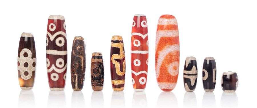 Ensemble comprenant dix perles tibétaines «dzi» en agate brune et orangée, à décor d'yeux et lignes ondulées. (L'une cassée).