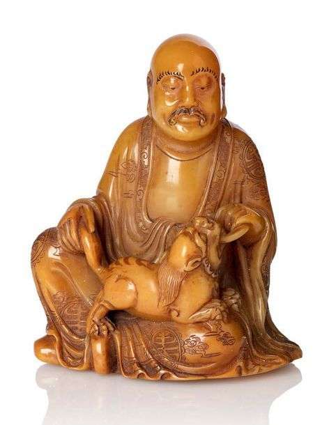 Petit sujet en stéatite représentant un luohan assis, accompagné d'un félin, son manteau orné du caractère shou, longévité.