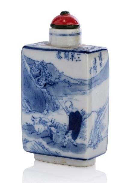 Flacon tabatière quadrangulaire en porcelaine, à décor en bleu sous couverte d'un bouvier et de deux dignitaires sur les berges d'un fleuve. Bouchon en verre couleur corail. Porte une marque Qianlong sur la base.