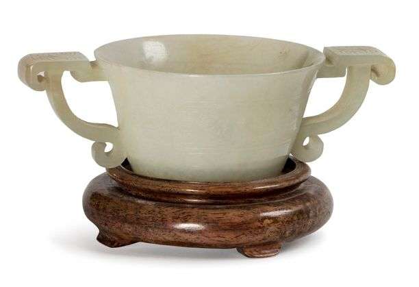 Coupe en jade blanc céladonné légèrement veiné de rouille, la paroi évasée à décor incisé de gui archaïsant, les deux anses plates à volutes, gravées de dragons stylisés.