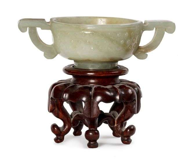 Coupe en jade céladon veiné de rouille et blanc, la paroi à motifs de boutons en relief, accompagnée de deux anses plates en forme de dragon stylisé. Avec socle en bois sculpté.