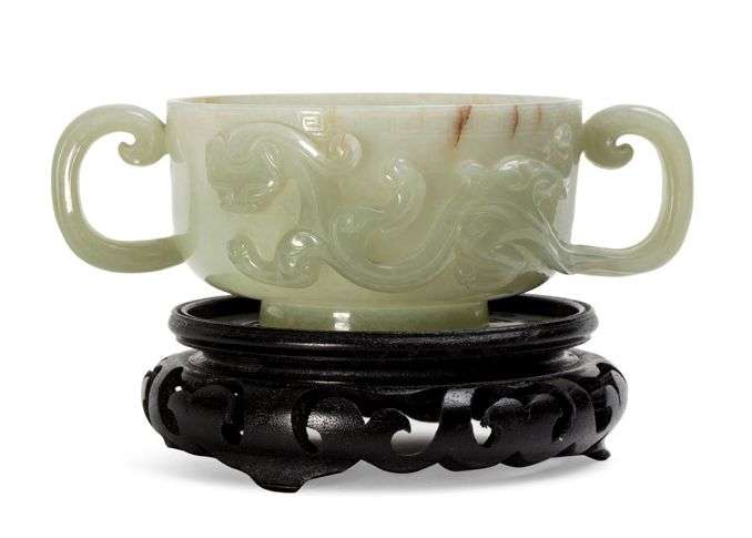 Coupe en jade céladon légèrement veiné de rouille, la paroi ornée en relief à décor de deux chilong dont les queues forment les anses, l'ouverture soulignée d'une grecque.