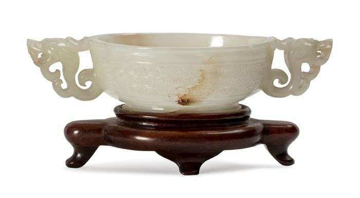 Coupe ovale en jade blanc céladonné légèrement veiné de rouille, le pourtour orné de leiwen, avec deux anses en forme de dragons. (Collée à son socle en bois)