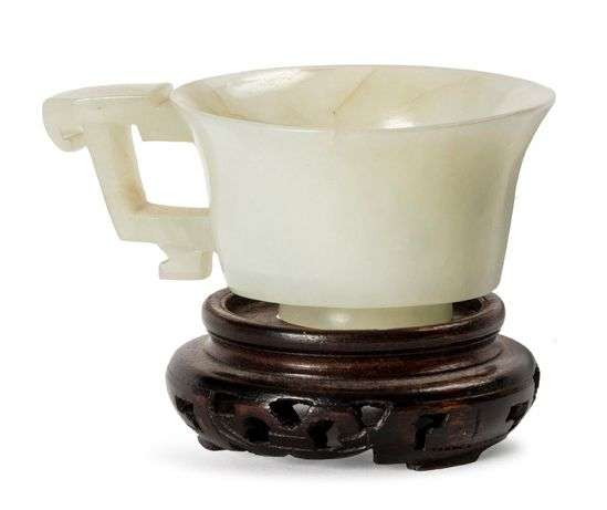 Petite tasse en jade blanc céladonné, la paroi évasée sur un petit talon, rehaussée d'une anse stylisée.