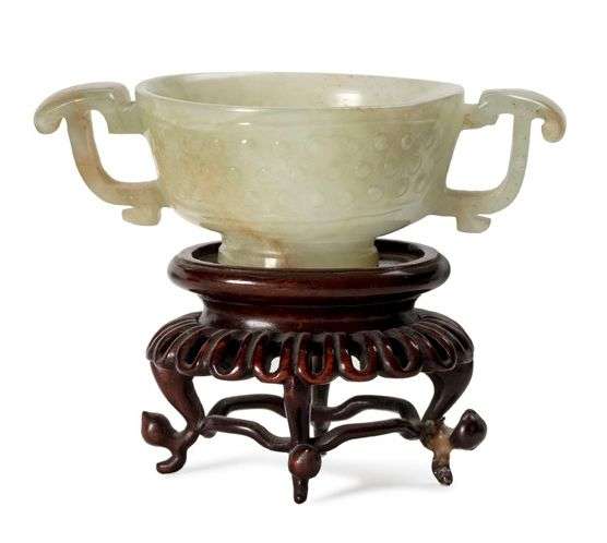 Coupe en jade blanc céladonné veiné de rouille, la paroi ornée de boutons en léger relief, rehaussée de deux anses en forme de dragons stylisés.