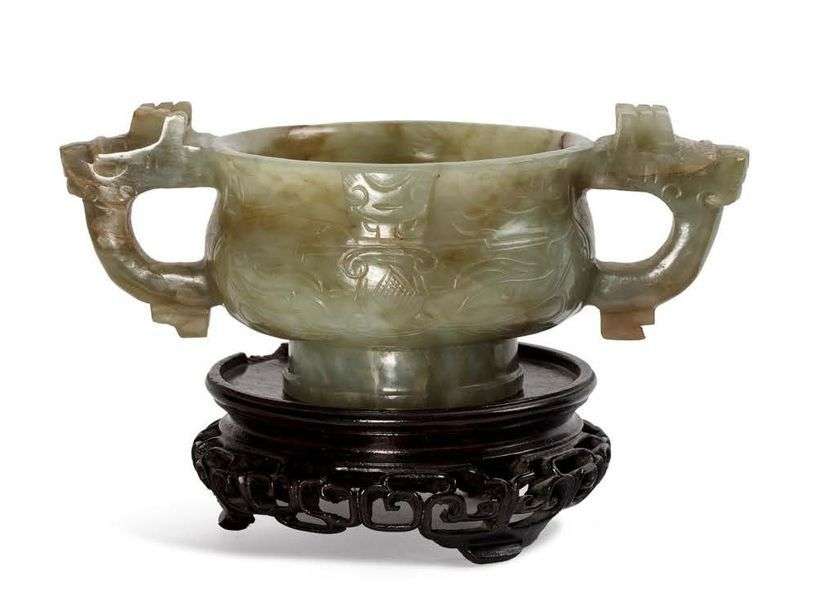 Coupe en jade céladon veiné de rouille, en forme de gui archaïque, le pourtour à décor archaïsant de masques de taotie et dragons gui, les deux anses en forme de dragon stylisé.