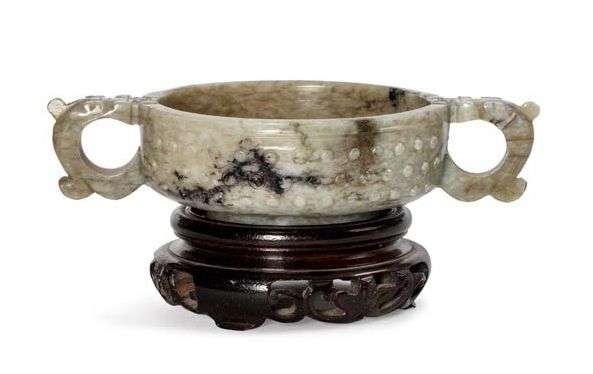 Coupe en jade opaque gris veiné de blanc, rouille et brun, la paroi ornée de boutons, et rehaussée de deux anses à tête de dragons.
