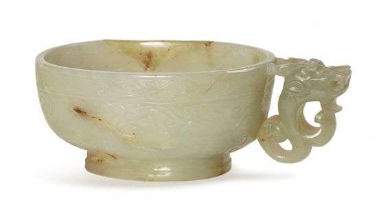 Coupe ovale en jade blanc céladonné légèrement veiné de rouille, le pourtour à décor incisé de volutes et vagues stylisées, rehaussé d'une anse en forme de dragon.