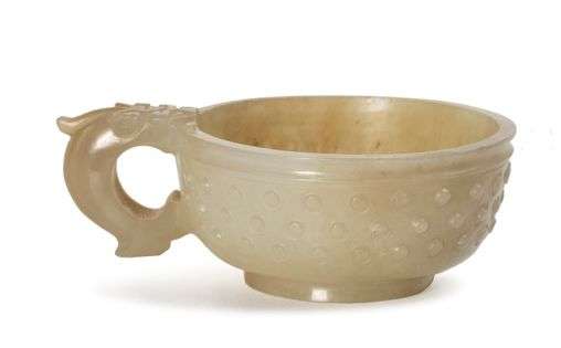 Petite tasse en jade céladon légèrement veiné de blanc et rouille, le pourtour à motifs de boutons en relief, avec une anse en forme de dragon dont la tête mord sur le bord.
