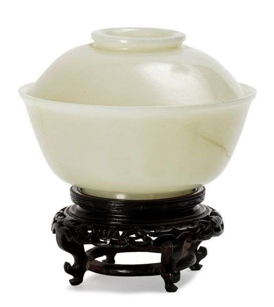 Coupe couverte en jade blanc, coupe et couvercle à paroi évasée sur petit talon. Sur son socle en bois sculpté.