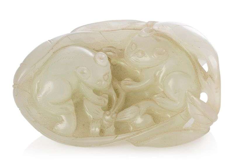 Pendentif en jade blanc sculpté de deux félins à l'intérieur d'une feuille, jouant avec un papillon.