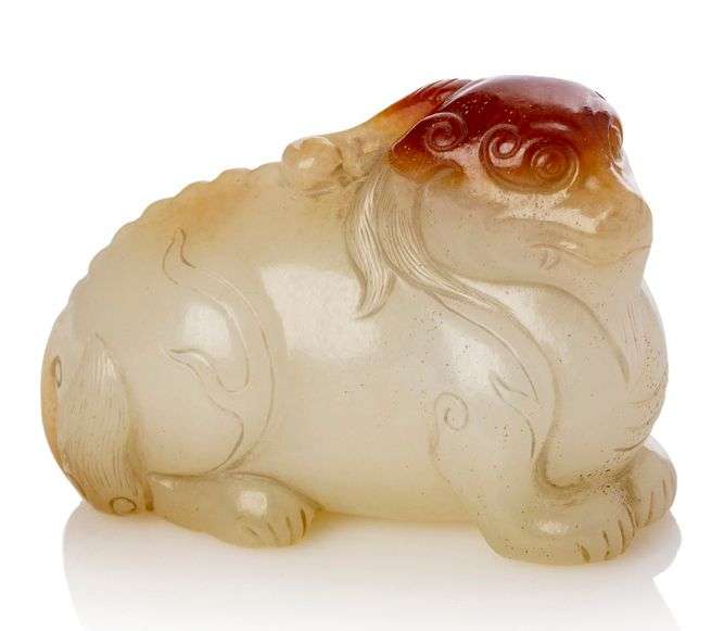 Pendentif en jade blanc veiné de rouille, représentant un Qilin allongé.