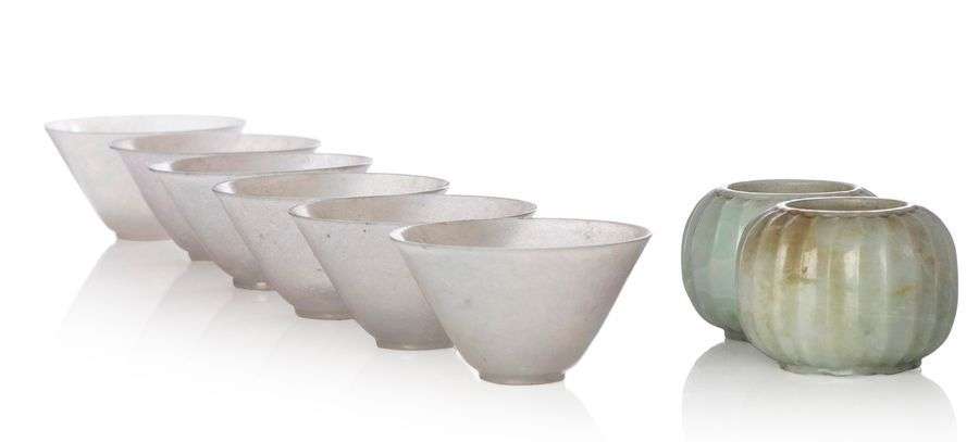 Lot comprenant six sorbets en jadéite translucide, et deux rince-pinceaux en jadéite reprenant la forme de coque de lotus.