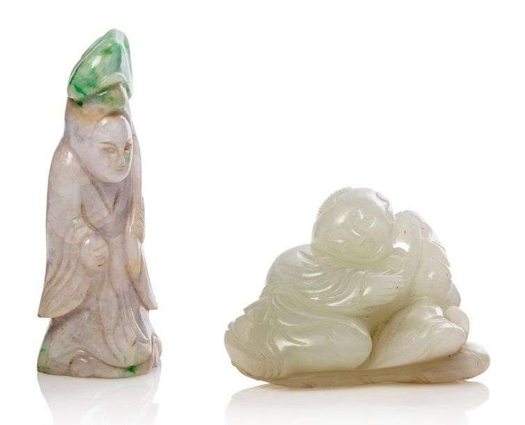 Lot comprenant un sujet en jade blanc représentant un enfant tenant une grande feuille de lotus sur laquelle il est assis| et un sujet en jadéite infusée de vert représentant une jeune femme s'abritant sous une feuille de lotus.