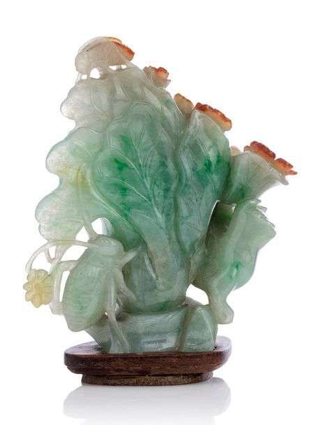 Groupe en jadéite (jade de Birmanie) translucide partiellement infusé de vert et de rouille, représentant un chou sur lequel grimpent un chat et un criquet.