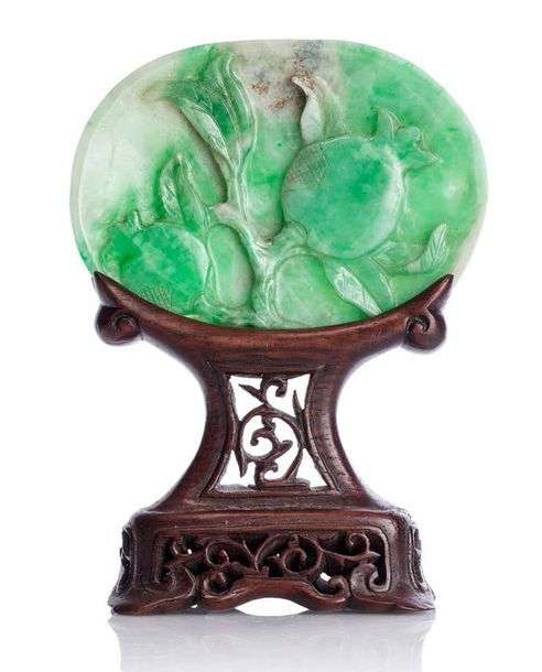 Plaque ovale légèrement creuse, en jadéite veinée de vert et blanc, sculpté en relief sur les deux côtés, de grenades et feuillages. Avec son socle.