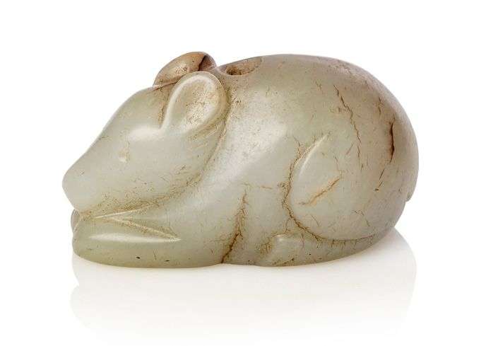 Sujet en jade légèrement infusé de brun, représentant un ours allongé.