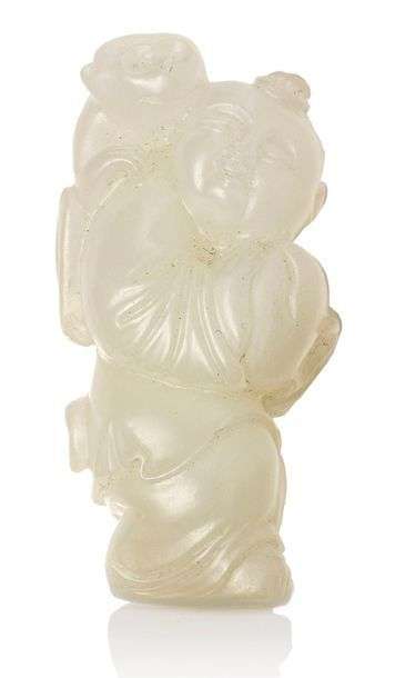Petit sujet en jade blanc céladonné, représentant un personnage et son singe.