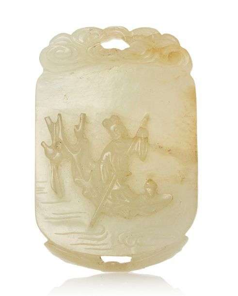 Plaque-pendentif en jade blanc veiné de rouille, sculptée en relief d'un philosophe descendant un cours d'eau sur un tronc d'arbre, le revers orné de quatre chauves-souris.