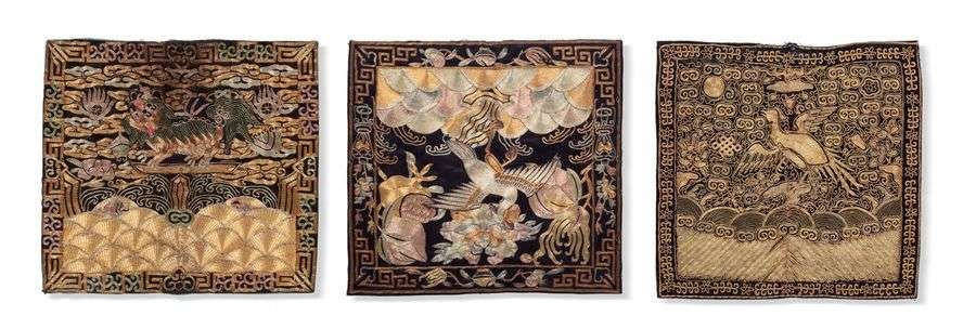 Trois insignes de rang buzi en satin de soie et lin brodé, l'un pour militaire, à décor de lion bouddhique| les deux autres, pour dignitaires de la cour, ornés d'oiseaux parmi nuages stylisés, fleurs et rinceaux feuillagés.