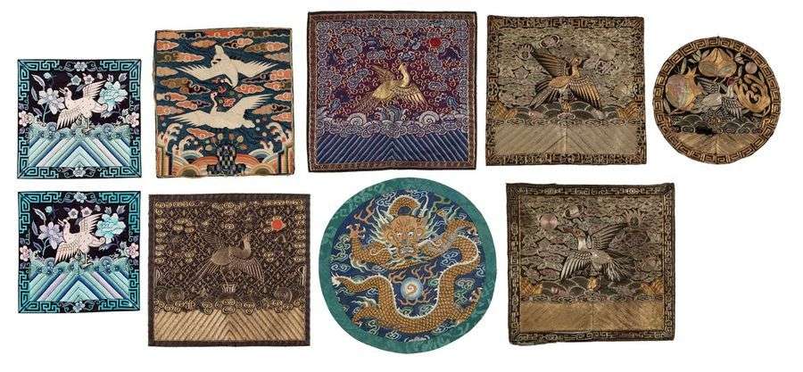 Lot neuf textiles comprenant un médaillon en soie kesi bleue à décor d'un dragon de face, au fil doré, et huit insignes de rang pour ministres lettrés, dont sept quadrangulaires et un circulaire, à décor brodé de grues, faisans, paon, oie sauvages, aigrettes, caille.