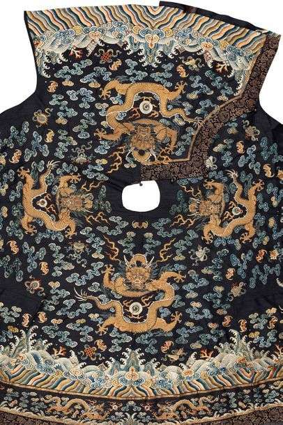 Lot de deux textiles comprenant: Une cape montée à partir d'une robe dragon, en soie bleue brodée aux fils polychromes et dorés de dragons de face et de profil, parmi nuages stylisés, motifs auspicieux et lishui| et un long panneau de soie bleu nuit brodée aux fils polychromes et dorés de trois dragons passant parmi nuages stylisés et motifs auspicieux au-dessus d'une bande de lishui, surmontés de neuf médaillons de dragons de face. (Fils tirés, coutures défaites, petites déchirures