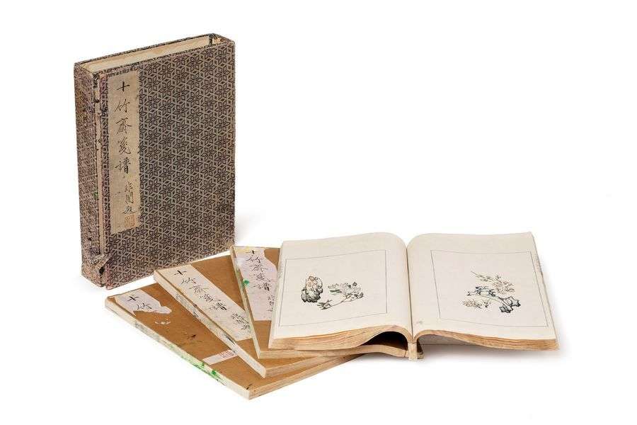 Ouvrage en quatre volumes réunis dans un coffret, représentant différents types de motifs décoratifs pour graver sur le bois, dont objets rituels, objets mobiliers, paysages, fleurs et végétaux, animaux mythiques, personnages célèbres, insectes, etc.