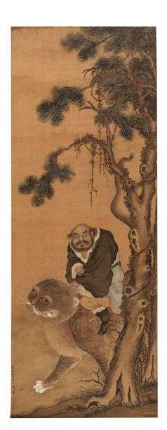 Peinture verticale en soie, encre et couleurs, représentant un luohan assit sur un tigre auprès d'un pin. Porte une signature apocryphe de Li Gonglin (actif au XIIe siècle) (Pliures)