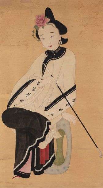Peinture en couleurs sur papier représentant une jeune beauté assise, songeuse, sur un tabouret de jardin, tenant une longue pipe, la jambe droite repliée, le pied posé sur le genou, une grande fleur de pivoine dans ses cheveux. (Quelques taches et usures, encadrée sous verre)
