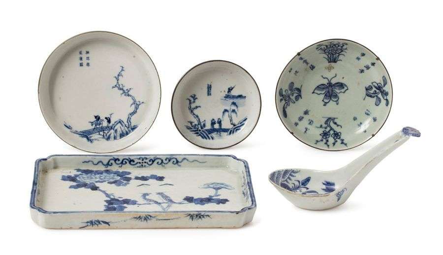 Ensemble de cinq objets en porcelaine de Hue et de Chine du Sud, comprenant deux coupes à décor d'un pont et embarcations, l'une marquée Nôi Phu (Nei fu)| l'autre marquée d'un poème à l'intérieur «soyez seul pour profiter de la nature, un plateau à décor de faisans, une cuillère et une petite coupe décrivant les quatres saisons et papillon au centre.