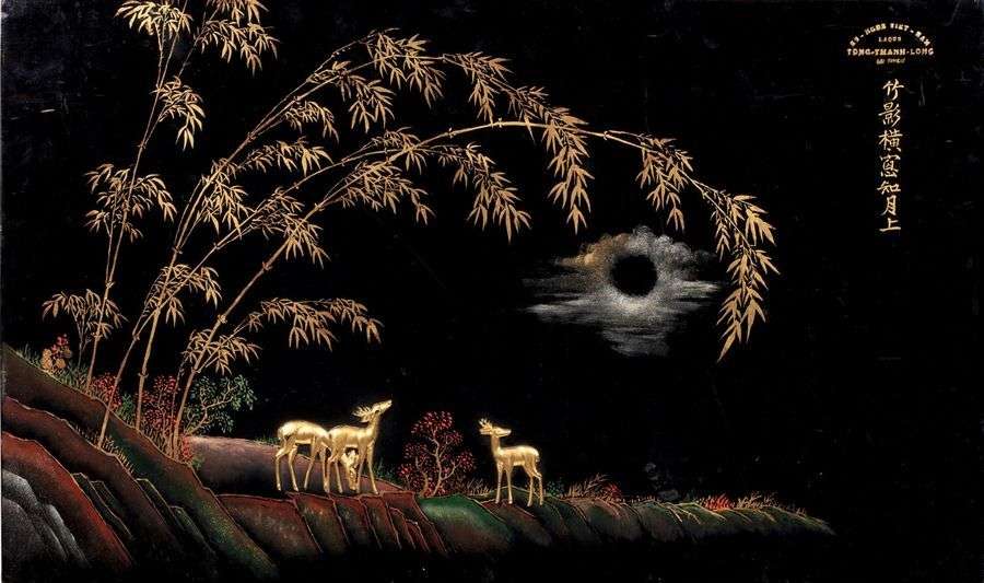Panneau en laque noire orné aux laques or et polychromes, de trois daims auprès de bambous, à la pleine lune, celle-ci légèrement cachée par un nuage. Avec inscription en haut à droite: Tong Thanh Lohc. (Petits accidents)