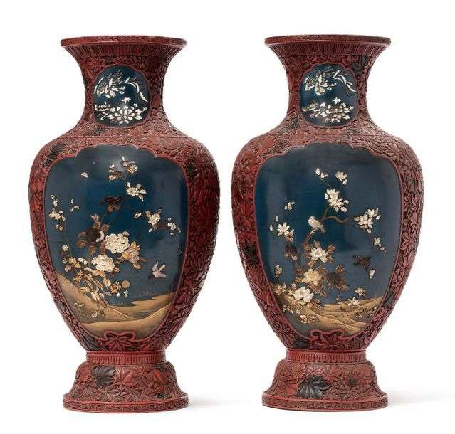 Paire de vases balustres en laque rouge sculptée de fleurs de chrysanthèmes, encadrant quatre médaillons en laque bleu et or, à décor en relief d'oiseaux et fleurs en os et nacre. (Petits manques)