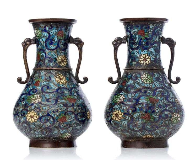 Paire de vase en bronze et émaux champlevés, à décor couvrant de rinceaux floraux polychromes, rehaussé de deux grandes anses.