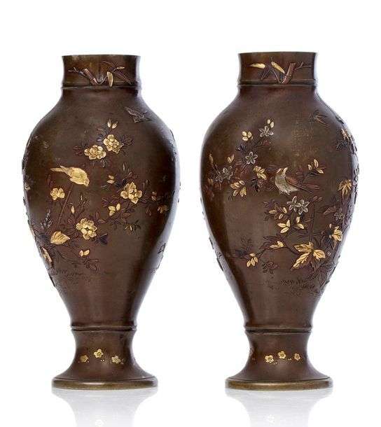 Paire de vases en sentoku à décor en iroe takazogan d'oiseaux en vol ou perchés sur des arbustes en fleurs, le petit col droit évoquant une section de bambou, la panse se rétrécissant vers un pied évasé. Marque sur la base. (Petits chocs sur le bord de l'un).