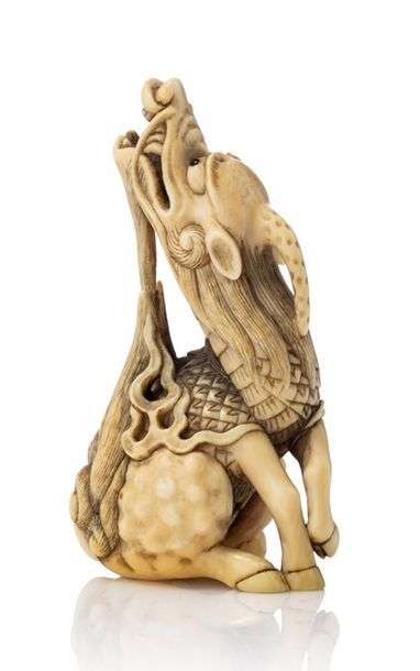 Deux netsuke en ivoire rehaussé de brun, l'un figurant un Kirin assis, la tête dressée vers le haut, signé Mitsuharu| l'autre représentant Ebisu brandissant un poisson auprès d'un enfant, signé Shiichi. (Manque à la patte arrière gauche du Kirin et au poisson d'Ebisu| gerces)